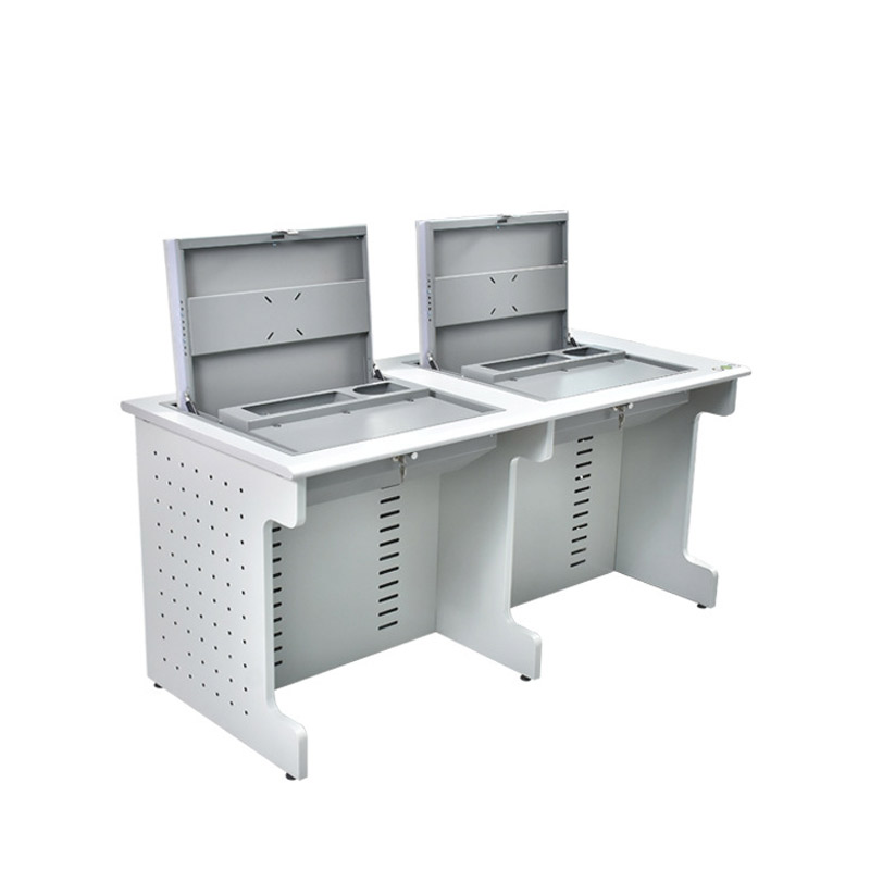 產品詳細介紹電腦翻轉桌,翻轉器與電腦桌配套使用,拉動開關按鈕液晶顯示屏會自動翻起,鍵盤也同時升起與桌面齊平。當不需要使用電腦時,可用手動按下翻蓋面板。整個翻轉器與桌面齊平,和普通的教室無異,產品具有防盜、防塵保持桌面平整,美化桌面等功能。電腦桌內還可以存放各類文具和學習用品,滿足一教室多用的需求