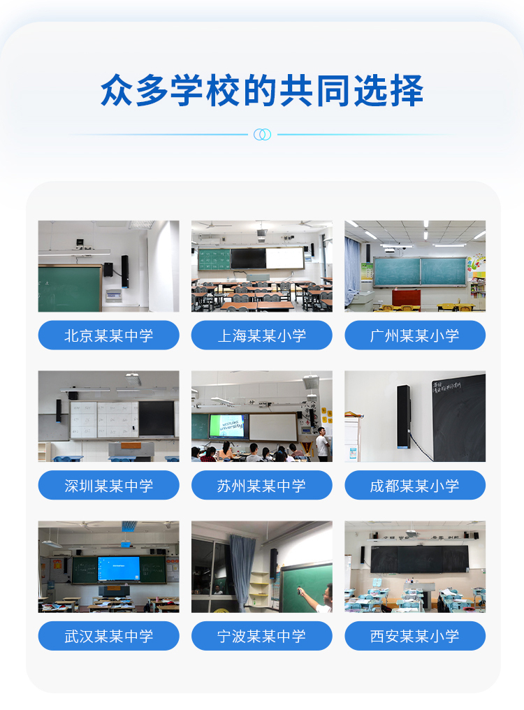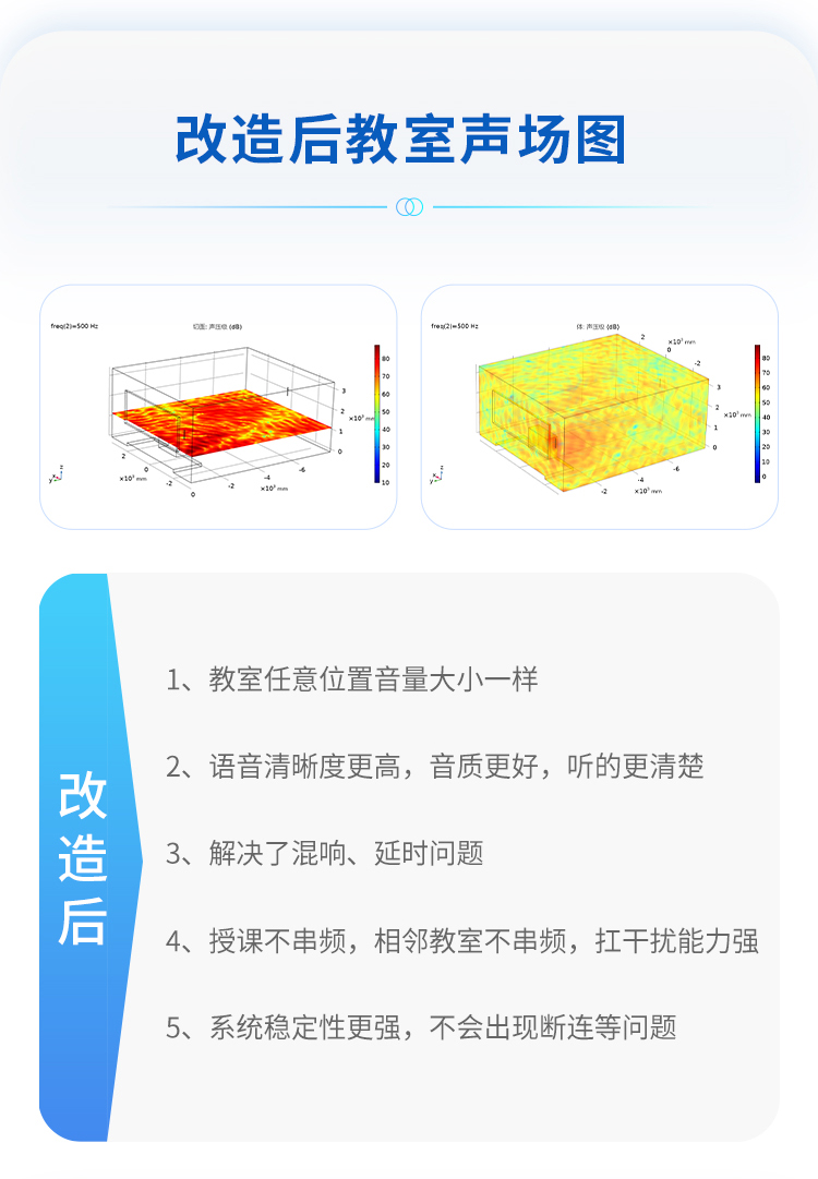 教室任意位置聲音大小一樣,達到前后排聲壓級差值在士2dB以內,優于美國《ANSI.ASA.S12.60.Part.1》 士2.5dB 標準要求。
