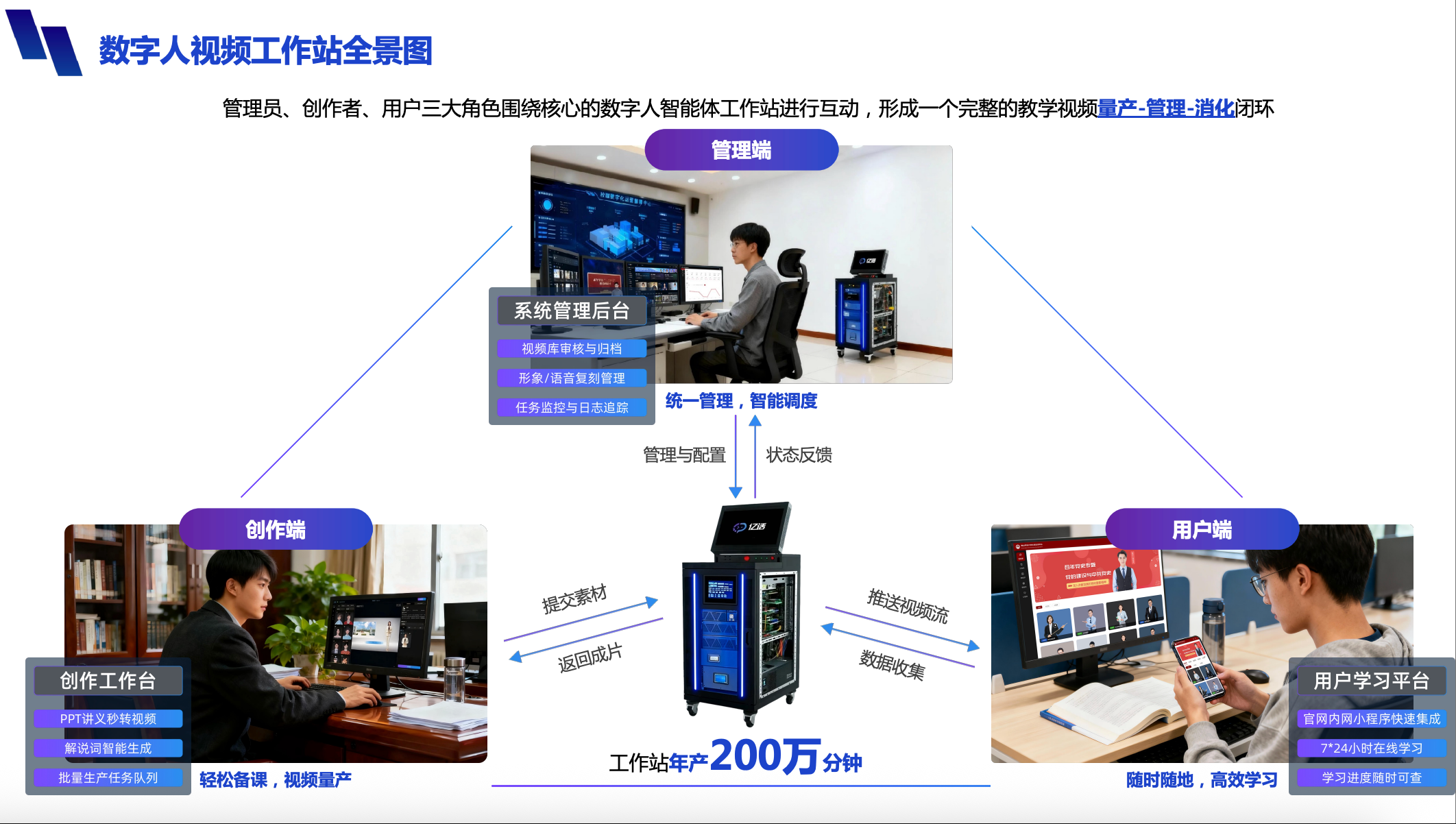 產(chǎn)品詳細(xì)介紹“億話-數(shù)字人智能體工作站全棧解決方案”是八點(diǎn)八數(shù)字科技面向高校推出的教育數(shù)字化一體化平臺(tái),深度融合大模型、數(shù)字人技術(shù)與智能體應(yīng)用,致力于為教師減負(fù)、為教學(xué)增效、為校園賦能。該方案支持**一鍵批量生成高質(zhì)量微課視頻**,將傳統(tǒng)數(shù)日的課件制作流程壓縮至數(shù)小時(shí),助力教師高效構(gòu)建校本資源庫;同時(shí)提供**真人級(jí)形象與聲音復(fù)刻**,打造親切可信的“數(shù)字教師”,實(shí)現(xiàn)7×24小時(shí)智能交互與精準(zhǔn)答疑。系統(tǒng)覆蓋教學(xué)、管理、宣傳、服務(wù)四大核心場(chǎng)景,可靈活嵌入學(xué)校官網(wǎng)、小程序、校園APP等多終端,并支持全棧本地化部署,確保數(shù)據(jù)安全與合規(guī)。目前已在華南理工大學(xué)、電子科技大學(xué)、華東師范大學(xué)等多所高校成功落地,正成為推動(dòng)高校教育數(shù)字化轉(zhuǎn)型、構(gòu)建智慧校園新生態(tài)的關(guān)鍵基礎(chǔ)設(shè)施。