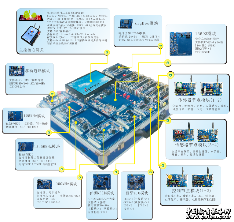 4.通信模塊涵蓋了GPRS通信、GPS定位、有源標(biāo)簽、藍(lán)牙4.0等模塊,主從模塊搭配設(shè)計(jì),實(shí)驗(yàn)開發(fā)非常靈活。