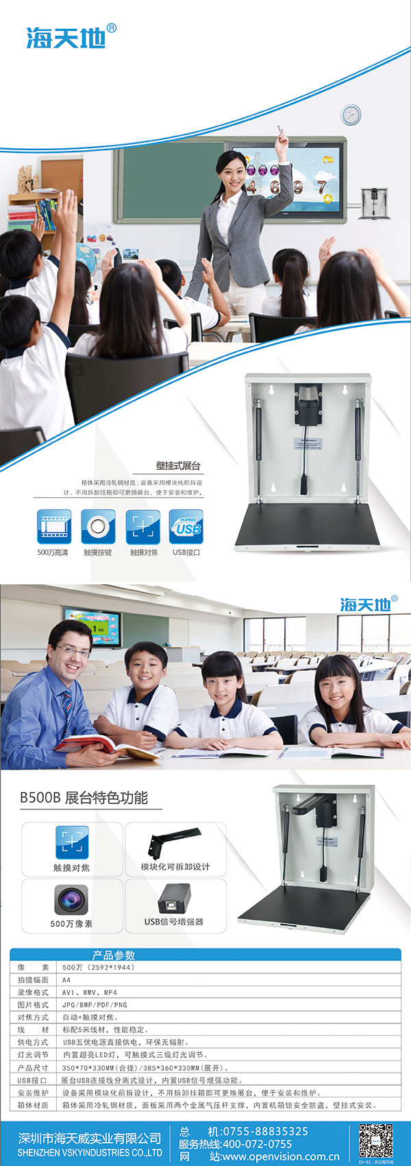 1、 500萬像素拍照,(通過連接觸摸一體機,可以對展示內容或者拍攝的圖片進行各種編輯,進行全屏展示,完美替代黑板,省時省力,讓學生易懂,易記,學習更加方便。