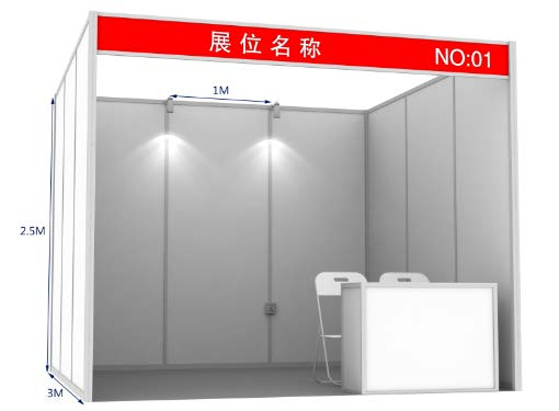 每個標準展臺包含: 咨詢桌1張H750X500X100),折椅2把,電源1處500W,射燈2盞。