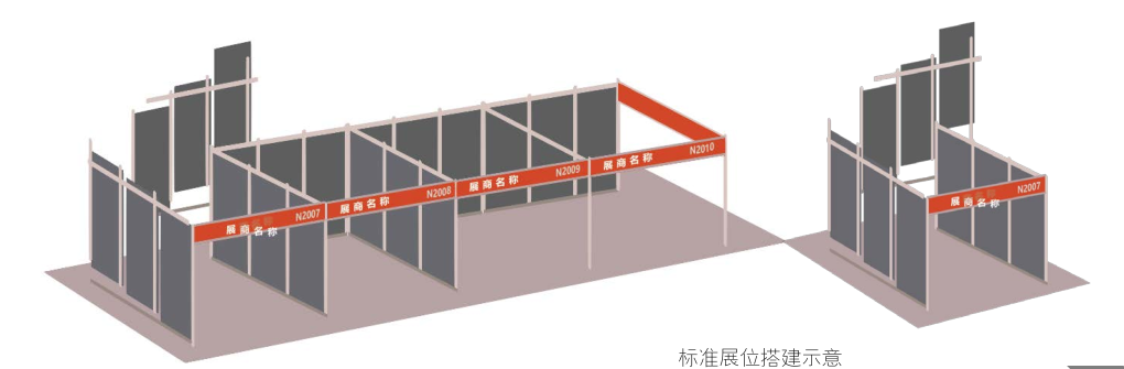 標準展臺由組委會指定展會搭建總代理負責建造,基本結(jié)構(gòu)為白色標準框架及圍板構(gòu)成。如果展商要另行增訂部分的設(shè)施及增加水、電、氣的使用,請參閱本手冊表格并向指定大會主場搭建服務(wù)商提前申報,費用參展商自理。