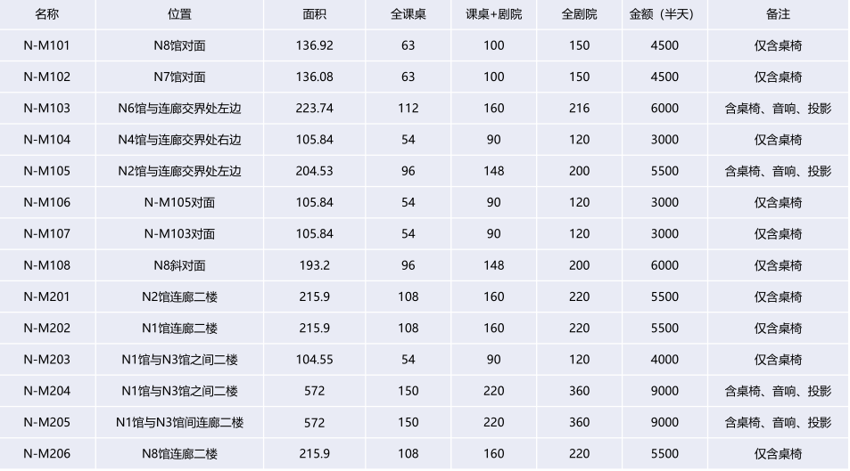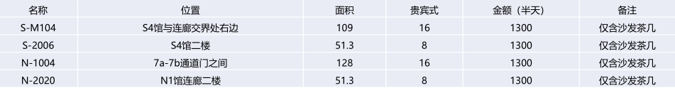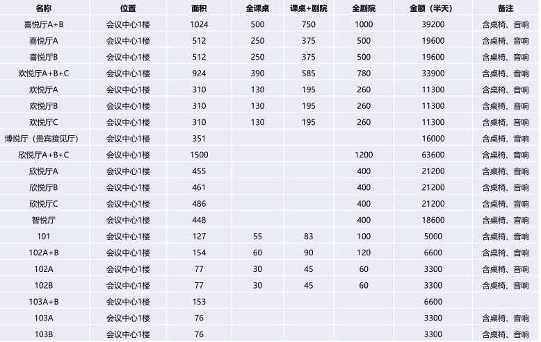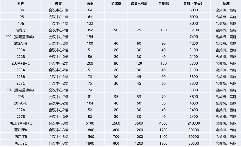 注:以上價格僅包括租賃會議室場地費,其他的各類設(shè)備(如:投影儀)費用需現(xiàn)場另行支付。