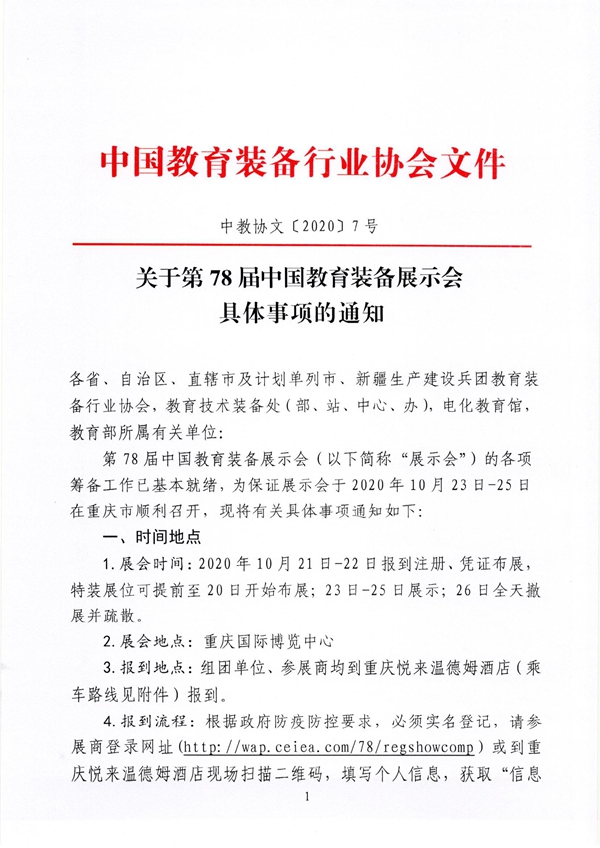 第78屆中國教育裝備展示會(以下簡稱“展示會”)的各項籌備工作已基本就緒,為保證展示會于2020年10月23日-25日在重慶市順利召開,現將有關具體事項通知如下: