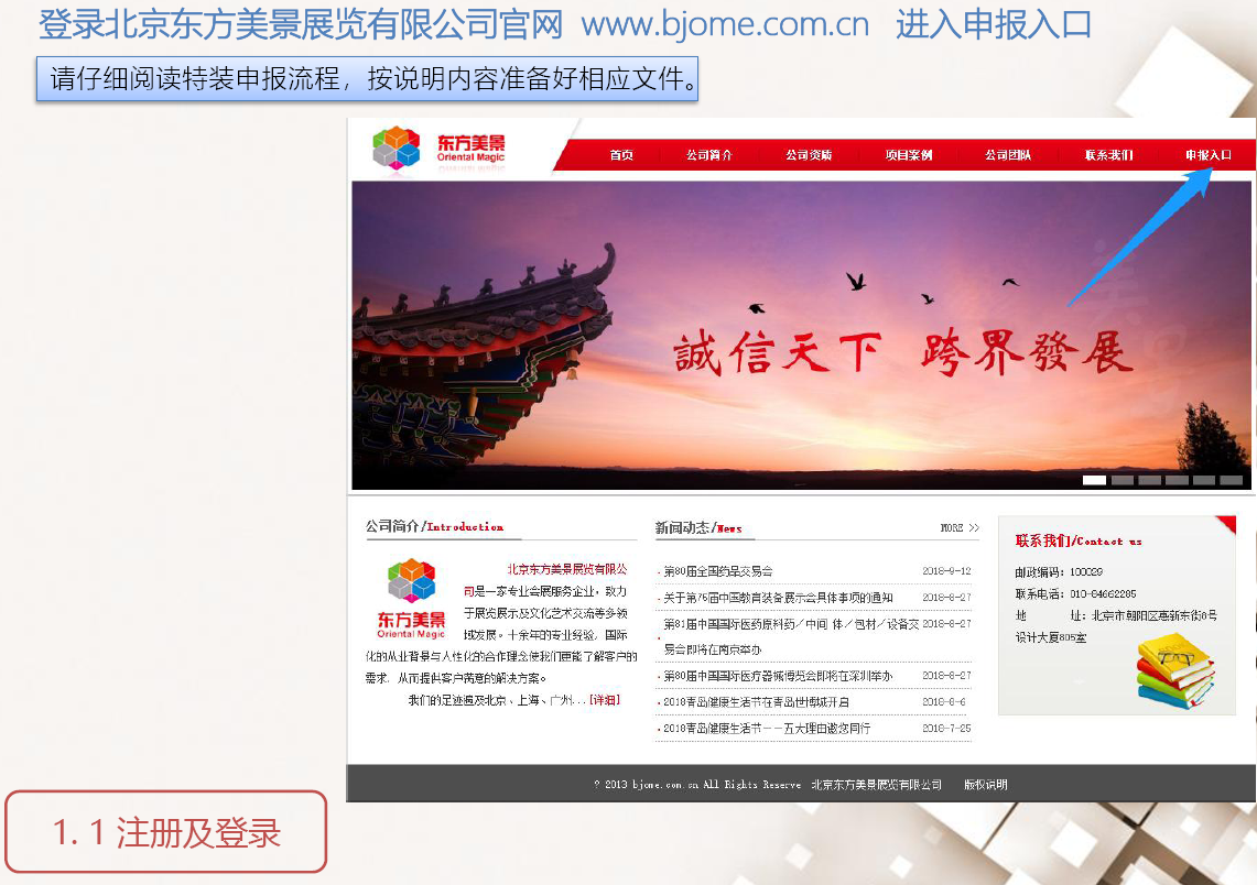 請搭建商登錄 北京東方美景展覽有限公司官方網(wǎng)站: www.bjome.com.cn 進(jìn)入申報入口進(jìn)行申報并繳費完成