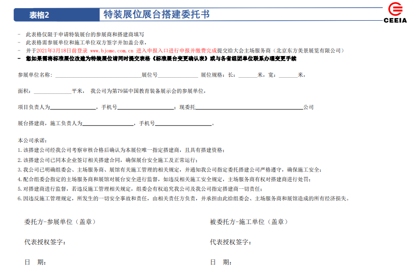 請參展商通知各自的搭建單位務(wù)必于2021年3月18日17:00前與北京東方美景展覽有限公司聯(lián)系辦理施工申請手續(xù),交納相關(guān)費用。逾期未辦理申報手續(xù),將產(chǎn)生滯納費用,詳見各附表。