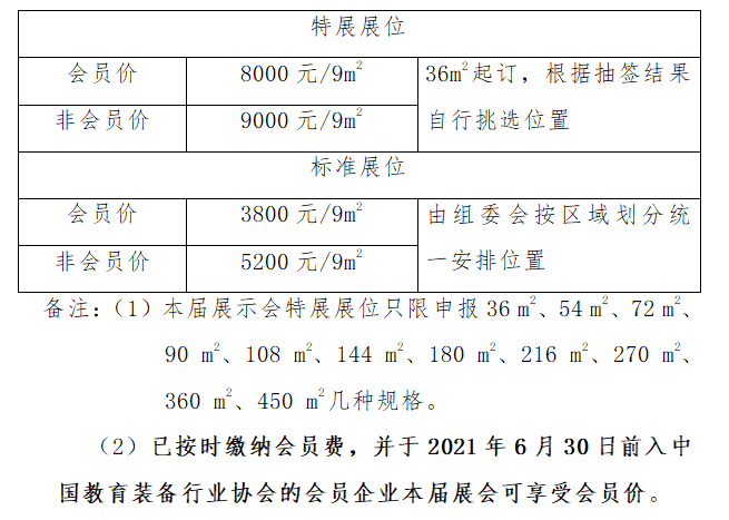 2.報名方式:原則上實行屬地化組團報名,即各企事業單位均在工商登記所在地報名。請各單位根據各自的生產銷售情況,依時申報展位,于2021年6月10日后登錄中國教育裝備行業協會管理系統(http://zh.ceiea.com)填報展位及參會人員信息。展位9m2/個,特展展位4個起訂。企業申報展位并繳納展位費用,后組委會統一確定時間分配展位,展位一經安排,展位費用將不予退還。報名及繳費截止日期:2021年7月05日。