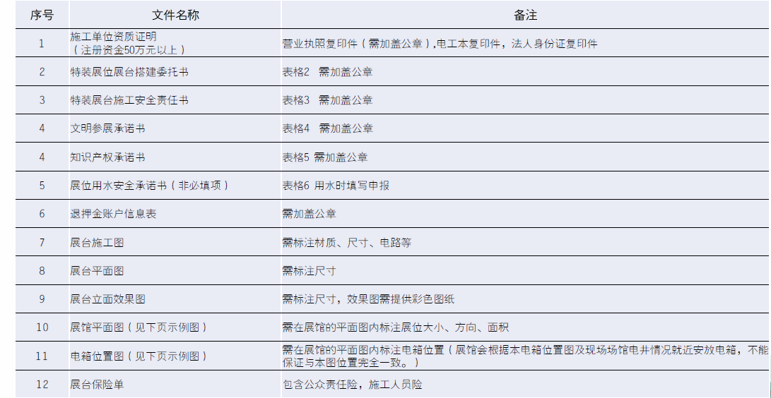 2)為統一管理報館資料,不接受缺少和即時補充文件。收到繳費通知單后不得修改訂單項目。所有特裝展臺效果圖及現場展臺必須標記出展位號。