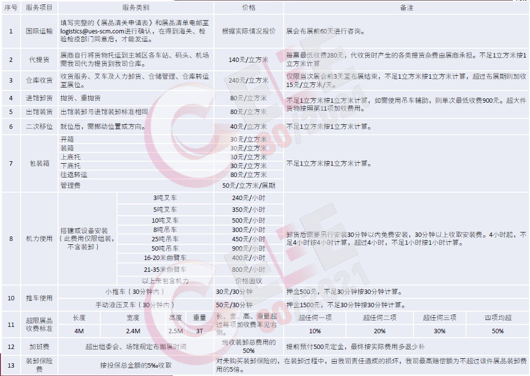 1、以上所有服務項若有需要,請參展商提前48小時書面預定并同時遞交附表1,經縱連公司確認后予以安排。任何少于48小時預定的機力申請,縱連公司將根據實時勞力和機力的使用情況另行安排,額外費用由展商承擔,如需特殊起吊工具的設備,請相關參展單位自行準備相關起吊工具。