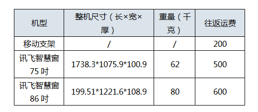 訊飛智慧窗大屏設(shè)備單臺往返運(yùn)費(fèi)及設(shè)備規(guī)格(加壁掛厚度增加30mm)如下: