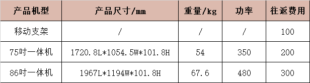 交互智能平板設(shè)備單臺往返運(yùn)費(fèi)及設(shè)備規(guī)格(加壁掛厚度增加30mm)如下: