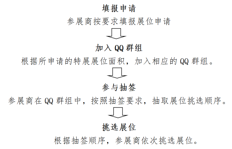 (2)標(biāo)準(zhǔn)展位展位順序仍按大區(qū)輪換的方法執(zhí)行,展位分布圖將另行通知。