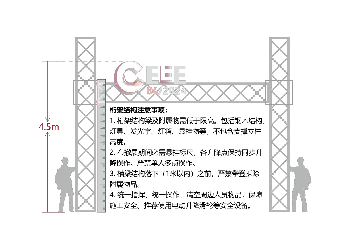 3.展臺(tái)搭建限高:4.5米;全館禁止搭建雙層結(jié)構(gòu)或超高展臺(tái),無懸掛物背板厚度不得少于20CM,龍骨間距不得大于40CM;桁架結(jié)構(gòu)展臺(tái)高度以及施工標(biāo)準(zhǔn)請(qǐng)參考下圖。