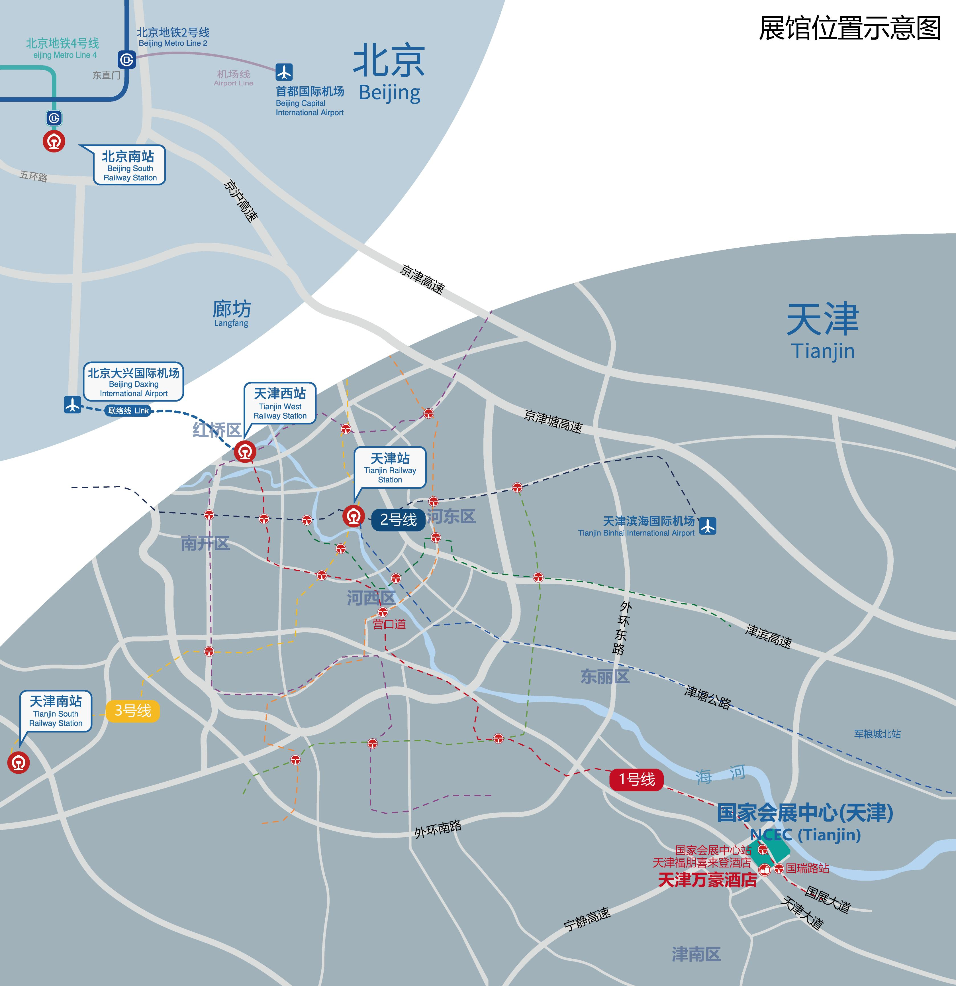 地鐵路線:天津南站地鐵站(乘坐3號線小淀方向)→營口道(轉乘1號線雙橋河方向)→國家會展中心地鐵站